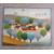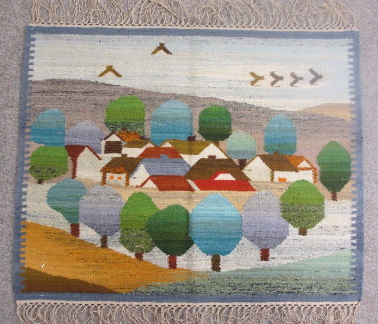 A POLISH KILIM RUNNER/THROW - colourful depiction of rooftops and trees, fringed ends with original label, 72 x 88cms