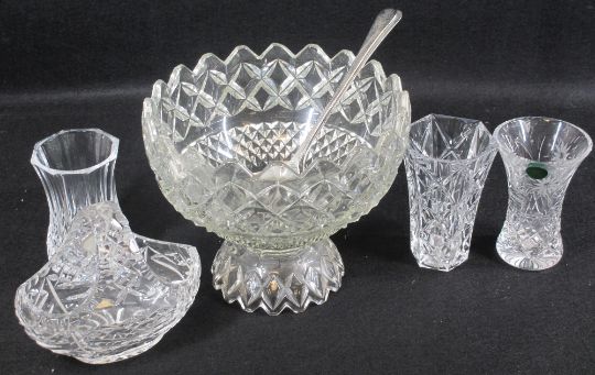 VINTAGE & LATER GLASSWARE, three boxes to include a Welsh Royal Crystal conical scent bottle and stopper, hobnail ship's decanter, pedestal fruit bowl and drinking glassware ETC