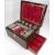 VICTORIAN ROSEWOOD VANITY TRAVEL CASE & CONTENTS to include various stopper top bottles and white metal capped jars and boxes, velvet lined, and gilt tooled to the back of the lid along with lift-out tray and pull-out rod to reveal lower side secret drawer, 17cms H, 31cms across, 23cms D