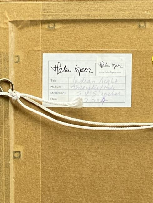 HELEN LOPEZ acrylic abstract, entitled verso 'Indian Nights', signed and dated 2004, 12 x 12cms and a colourful unnamed abstract, signed label verso, 14 x 10cms