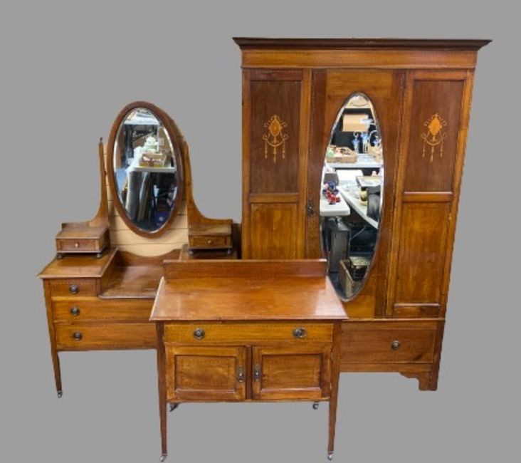 EDWARDIAN INLAID MAHOGANY THREE PIECE BEDROOM SUITE comprising mirrored single door wardrobe having inlaid upper panels and boxwood string inlay on a single drawer base section, 202cms H, 130cms W, 46cms D, oval mirrored dressing chest, 190cms H overall, 112cms W, 47cms D and a railback washstand with single frieze drawer and twin lower cupboard doors, 90cms H, 92cms W, 47cms D