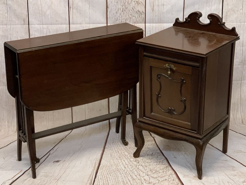 EDWARDIAN MAHOGANY SUTHERLAND TABLE, 72cms H, 75.5cms L, 18.5cms W (closed) and a similar period mahogany purdonium (lacking interior liner), 80cms H, 41.5cms W, 39cms D