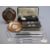NEAT SILVER & OAK EASEL GOLF PRESENTATION SHIELDS, A PAIR - each bearing, in silver, the Caernarfonshire & District Golfing Union, 'memento for winner of team championship 1929', Birmingham hallmark, a silver whisky label and chain, Birmingham hallmark, a pair of W M F Inox German silver handled knives with small forks, two neat ebony clothes brushes, each with silver initials, a cased silver presentation spoon (one of a pair) and a porcelain Crown Staffordshire floral decorated sherry label with chain