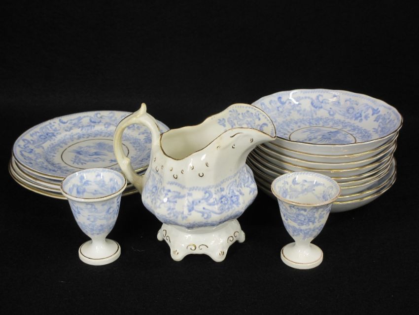 BLUE & WHITE TEA & OTHER TABLEWARE including Booths Old Willow, Wedgwood, dragon decorated pedestal eggcups ETC