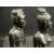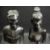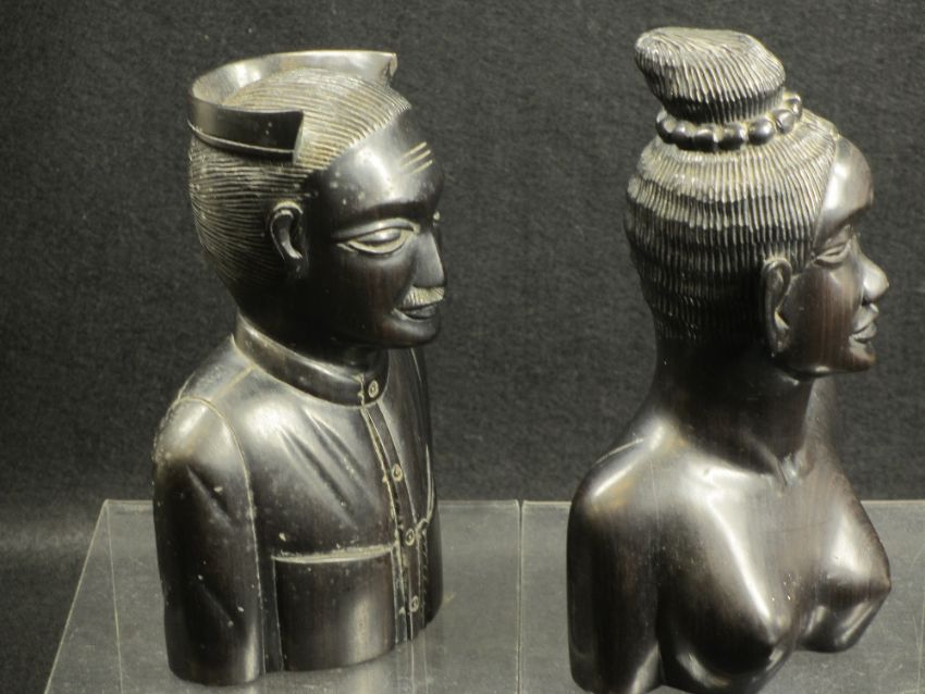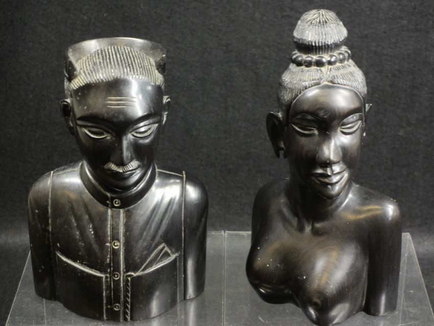 CARVED EBONY BUSTS of a man and woman, 20cms H the tallest