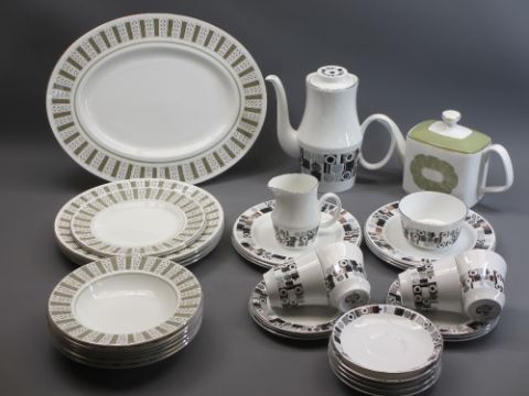 ROYAL GRAFTON SOMBRERO PATTERNED TEA/COFFEE WARE - 24 pieces, a Royal Doulton Sonnet oblong shaped teapot and 13 pieces of Susie Cooper Persia patterned dinner ware - oval meat platter, 4 x dinner plates, 2 x smaller plates and 6 x circular shallow dishes