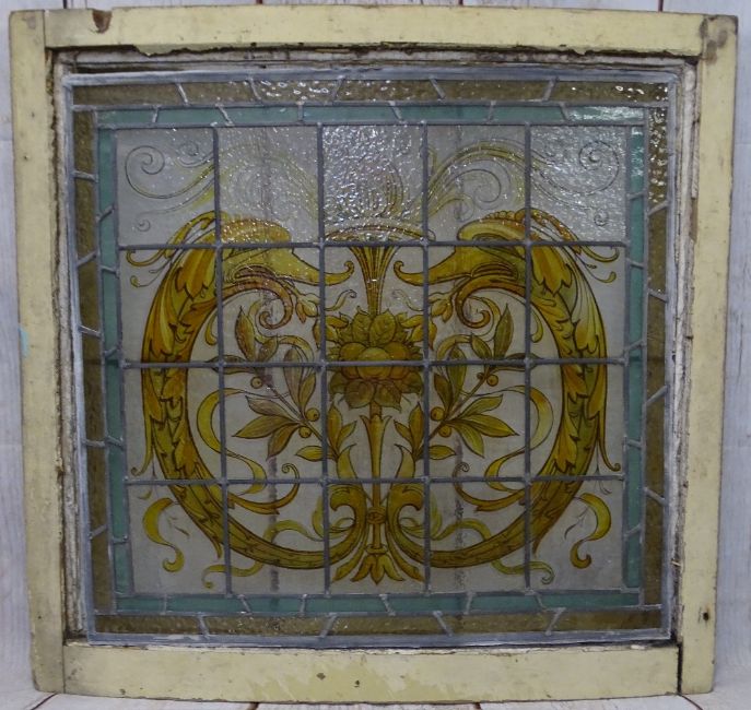 STAINED & PAINTED LEADED GLASS WINDOW PANEL - in slightly curved frame, 78 x 85cms overall measurements. N.B. Care required, panel loose in frame
