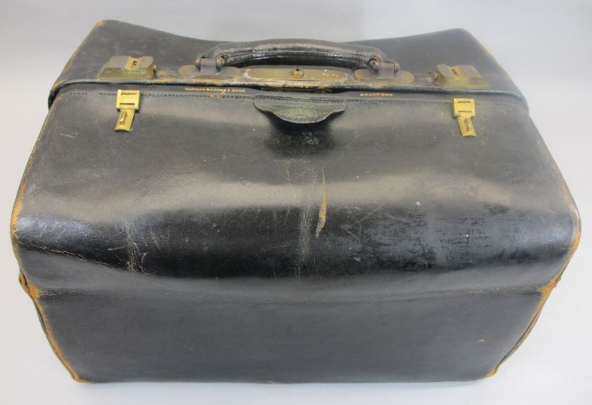 TRAVELLING CASE - a comprehensively fitted gentleman's travelling case marked 'Manoah Rhodes & Sons Bradford' and comprising silver topped glass containers and electroplated items such as travelling ink well, match striker and brushes and mirrors etc with ivory backs, all bearing owner's monograms