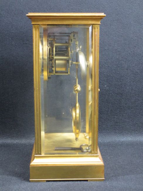 LEROY & FILS, PARIS BRASS & BEVELLED GLASS CASED MANTEL CLOCK, the dial set with Roman numerals, twin wind apertures and visible escapement before a pendulum driven bell strike movement, no. 18505, pendulum and key included, 32cms H, 18cms W, 15cms D