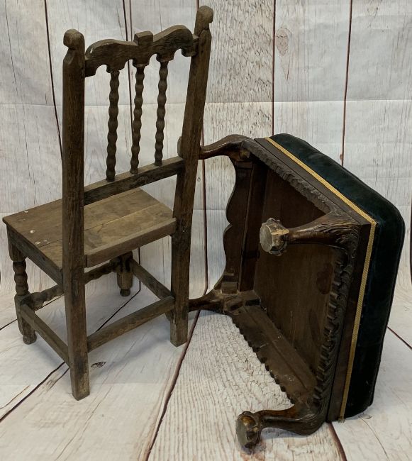 ANTIQUE & LATER FURNITURE PARCEL (3) to include a cushion top carved stool on ball and claw feet, 38cms H, 65cms W, 62cms D, oak hall chair with bobbin detail, 108cms H, 42.5cms W, 34cms D and an oak barley twist gate leg dining table, 72cms H, 92cms L, 52cms W (closed)