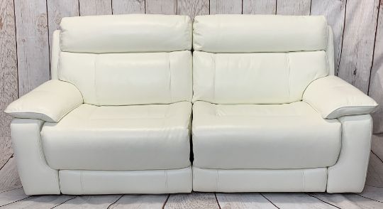 NEAR NEW DFS LUCIUS SNOW TWO SEATER WHITE LEATHER SETTEE & MATCHING ARMCHAIR - purchase receipt for 24th April 2021 including 5 year sofa care, each item with electrical four function button unit and USB port, 100cms overall H, 210cms L, 55cms seat D and 100cms H, 110cms W, 56cms seat D measurements respectively,  power cords included and a quantity of scatter cushions