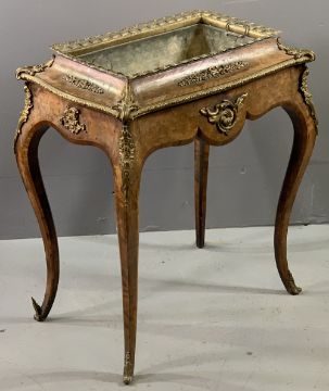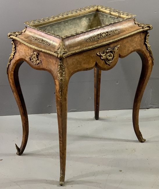 EMPIRE STYLE WALNUT PLANTER with brass embellishments throughout, on serpentine supports, 79cms H, 69cms W, 45cms D
