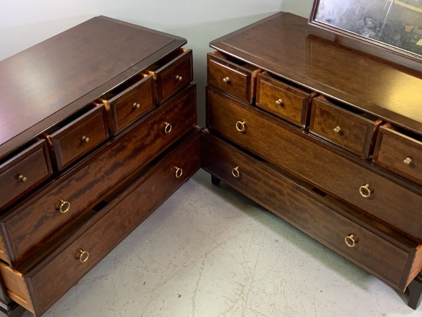 STAG MINSTREL BEDROOM FURNITURE (4) - comprising dressing chest, 138cms H, 107cms W, 47cms D, chest of four short over two long drawers, 73cms H, 107cms W, 47cms D and a pair of narrow chests of drawers, 73cms H, 53cms W, 47cms D