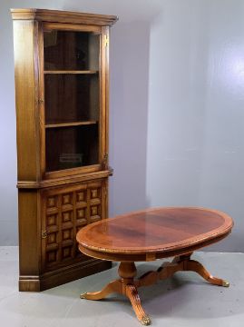 RUSTIC STYLE TWO PIECE FLOORSTANDING CORNER CUPBOARD with square fielded panel effect lower section and a beech effect oval coffee table on pedestal supports, 46cms H, 125cms W, 77cms D