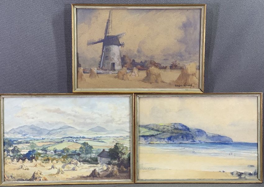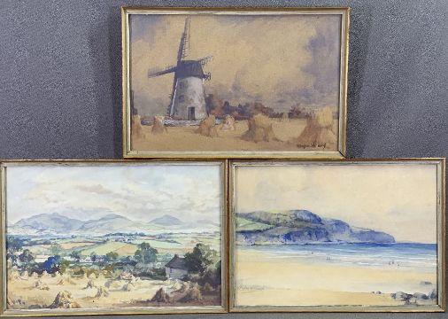 H HUGHES WILLIAMS two small watercolours - windmill scene, seaside scene and one other - hay bales and mountain scene, all approximately 21 x 32cms