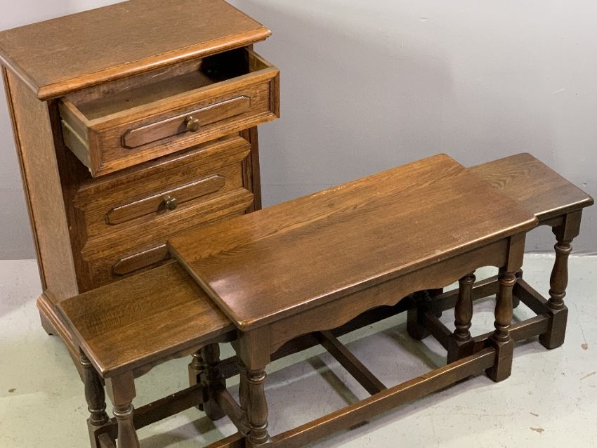 FURNITURE ASSORTMENT (3) - narrow five drawer chest, 79cms H, 54cms W, 32cms D, similar style nest of three coffee tables and a contemporary square standard lamp