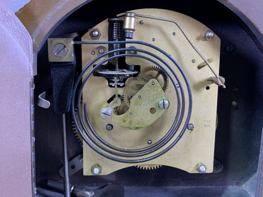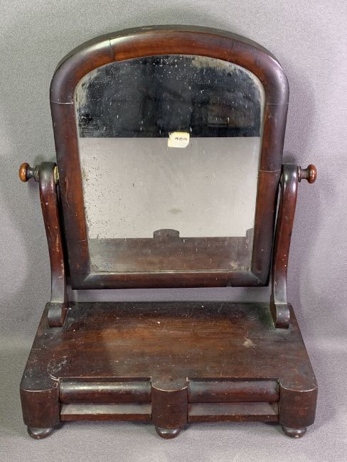 MAHOGANY SWING DRESSING TABLE MIRROR with two base drawers, a polished Smiths mantel clock and other treen ware