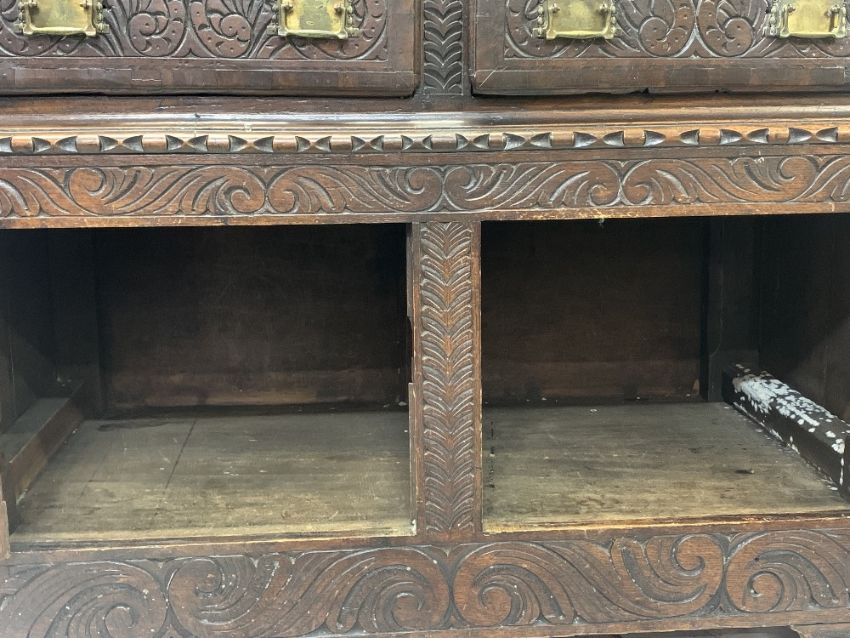 ANTIQUE & LATER CARVED OAK SIDEBOARD - the railback and extended top with edge carving and central face to the rail and a carved dog panel to the top over a base section of two oak lined drawers and two lower cupboard doors on corner bracket feet, the whole having heavily carved scroll and leaf detail, the lower door panels with griffins, 12cms overall H, 131.5cms W, 52cms D