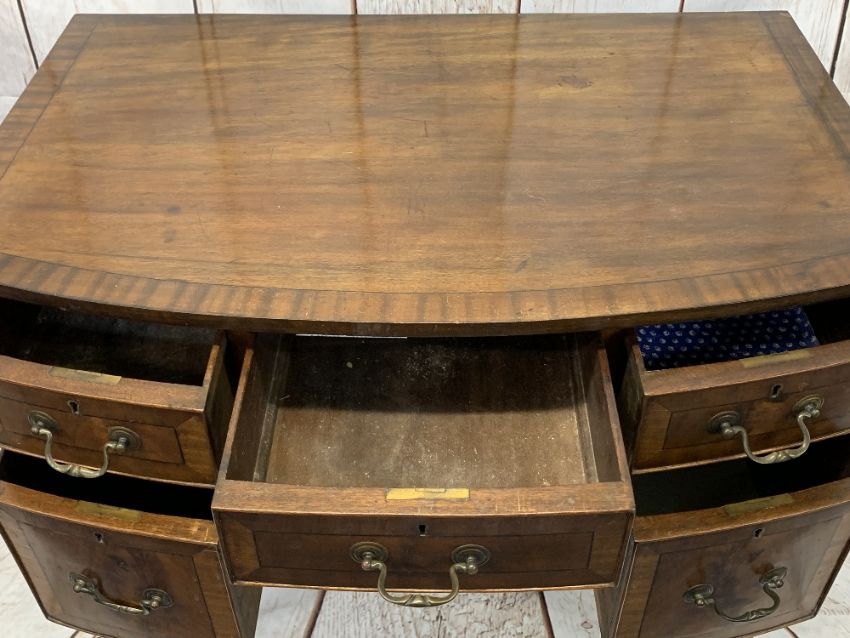 VINTAGE MAHOGANY BOW FRONT LADY'S DESK - having three frieze drawers and two larger lower drawers with shaped apron to the centre on tapering supports with spade feet, 84.5cms H, 91cms W, 59cms D