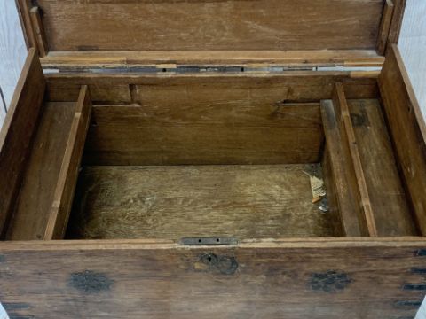 VICTORIAN TEAK LIDDED CAPTAIN'S CHEST - having iron carry handles with twin interior candle boxes having carving to the lids, one over a secret storage cabinet, the exterior having iron bands to the front corners and applied metal floral detail on a plinth base and with arched detail, 52.5cms H, 96cms W, 57cms D