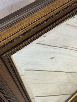A LARGE MIRROR - wooden framed with bevel glass, 92 x 116cms