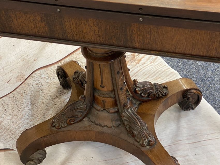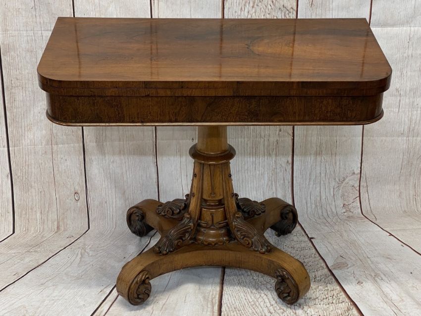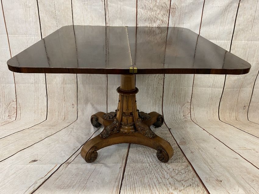 ROSEWOOD FOLDOVER TEA TABLE - Regency on carved support, 74cms H, 92cms W, 46cms D (closed)