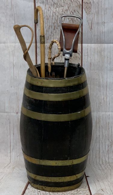 BRASS BANDED OAK BARREL STICKSTAND WITH CONTENTS - 61cms H, 35cms W