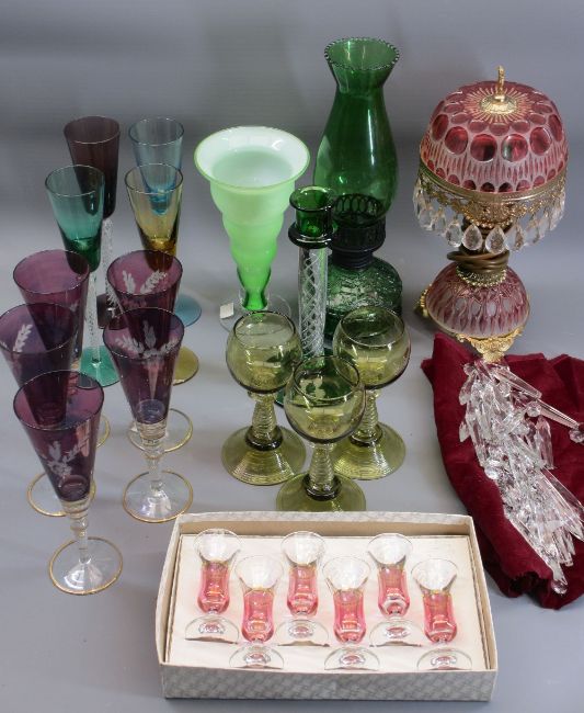 AIR TWIST STEM & OTHER DRINKING GLASSWARE, Air Twist stem candlestick, loose quantity of glass lustres, vintage colourful table lamps, ETC