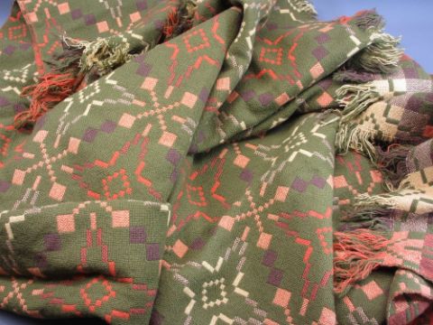 WELSH WOOLLEN BLANKET - with 'Tregwynt' label, traditional style reversible pattern in green with autumnal colours, 232 x 200cms