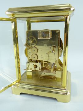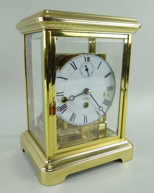 MODERN KIENINGER BRASS 8-DAY CHIMING MANTEL CLOCK, model J0212, white Roman dial with subsidiary seconds, three train movement with Whittington, St. Michael and Westminster chime, striking on eight gong bars, in four glass case, with key, 18.5w x 15.5d x 25cms hComments: excellent condition