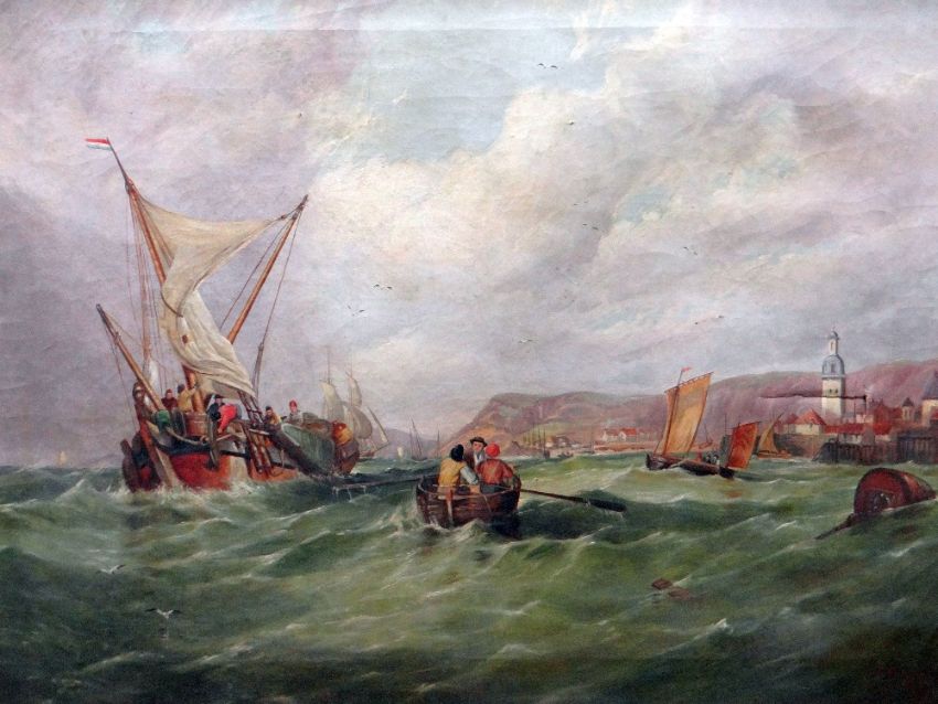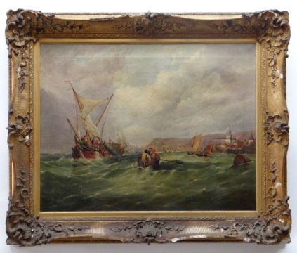 CIRCLE OF AUGUSTUS WALL CALCOTT RA (1779-1844) oil on canvas - Dutch Fishing boats in rough seas, dated 1857, attribution on the slip, 70 x 90cms