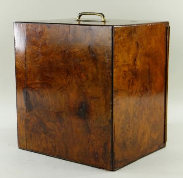 EARLY 19TH CENTURY BURR ELM TABLE CABINET, top with flush gilt brass handle, asymmetric doors with Bramah lock, enclosing three drawers with flush handles, 32.5h x 30w x 25cms d