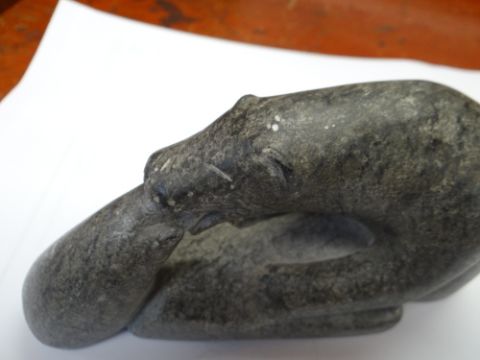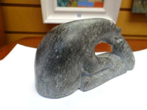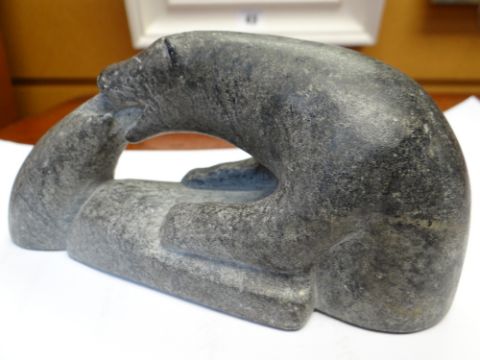 INUIT SUGLUK/SALLUIT CARVING, of a polar bear hunting a seal on an ice floe, by Markusi Ittuapakaat Ningiurluut (Canadian, b. 1919), base incised numerals E9-1124, 15cms long