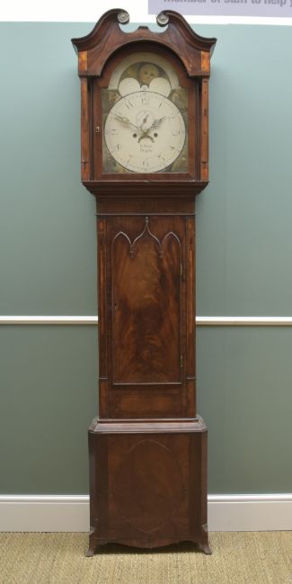 LATE 19TH CENTURY MAHOGANY & EBONY STRUNG 8-DAY LONGCASE CLOCK, W. Onions, Broseley (Shropshire), painted moon face dial, with subsidiary seconds and calendar aperture, hood with swan neck pediment above Gothic arch shaped door, inlaid sides and base, splayed feet, 226cms high