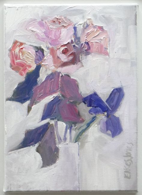 ALASTAIR ELKES-JONES oil on canvas - still life, entitled verso 'Four Roses with Iris', signed, 25 x 35cms