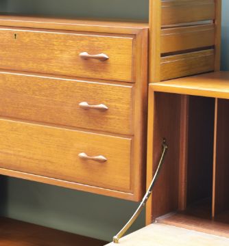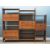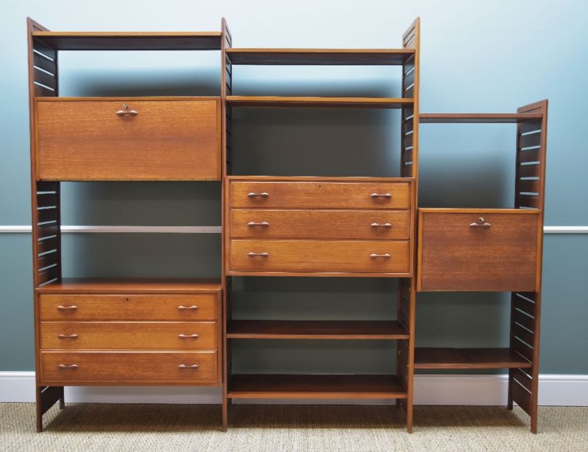 STAPLES 'LADDERAX' TEAK LOUNGE UNIT, comprising free standing uprights, adjustable shelves, drawers and cupboards on metal braces, 202h x 245w x 41cms