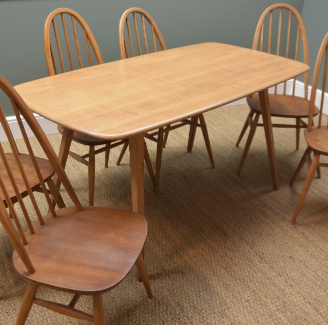 ERCOL ELM DINING SUITE, comprising table and six 'Quaker 365' chairs, table 153cms long x 77cms wide (7)