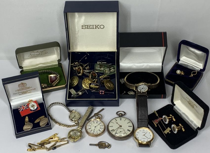 14CT GOLD CASED LADY'S FOB WATCH, silver cased gentleman's key wind pocket watch, other lady's wristwatches, gentleman's cufflinks and other items, the fob watch, 35grms gross including movement and metal dust cover, inner case back stamped '14K'
