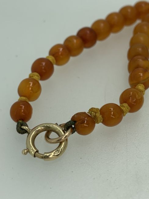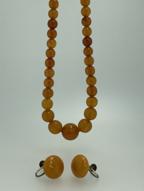 SINGLE STRAND AMBER BEAD NECKLACE - with 9ct gold clasp and a pair of earrings similar in appearance, 44cms overall L open, the necklace having 57 graduated beads, 12mm the largest, 4mm the smallest, 16grms the necklace