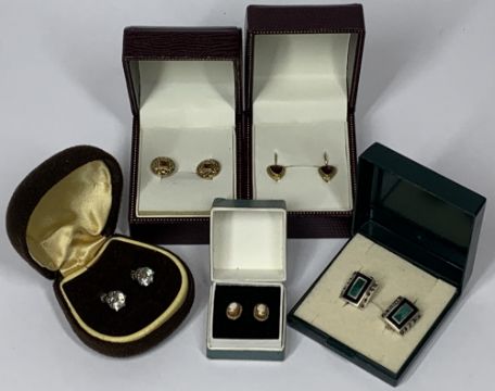 THREE PAIRS OF 9CT GOLD EARRINGS and two pairs of silver earrings, all boxed