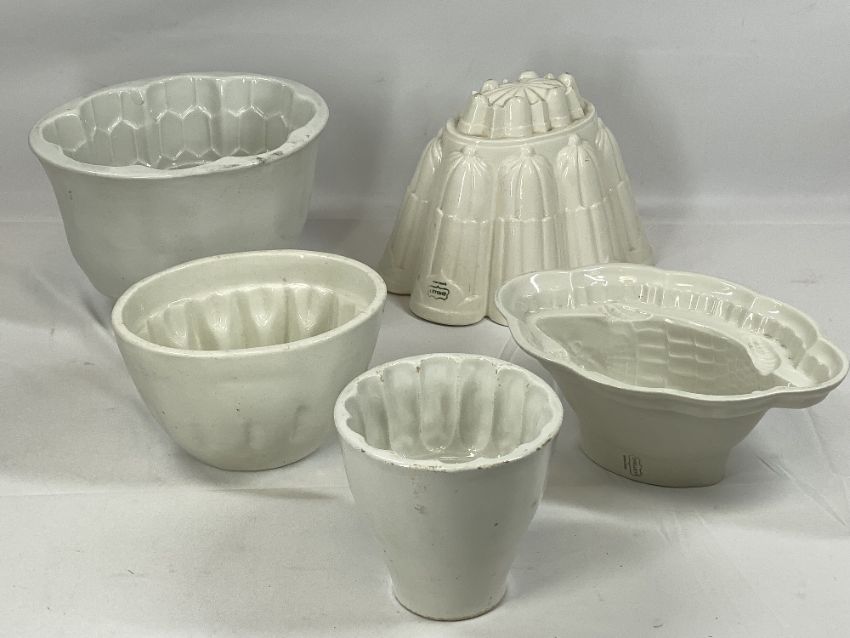 VINTAGE JELLY MOULDS (5) including two marked Shelley