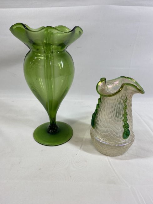 IRIDESCENT GLASS VASE - 16cms tall, and a green glass pedestal vase with pontil mark