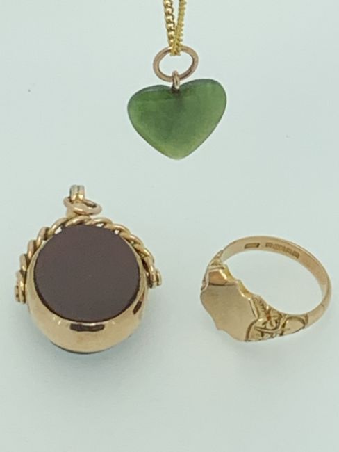 9CT GOLD JEWELLERY, 3 ITEMS to include a signet ring dated 1849, the blank shield shape top having heart and leaf decorated shoulders, size T, 6.1grms, swivel fob set with hard stones, 4cms overall L and a fine link necklace with heart shape hard stone pendant, 27.5cms overall L