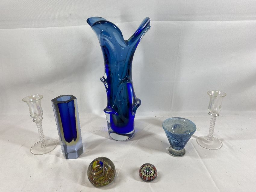 GLASSWARE - Art and vintage glassware including a tall bark effect vase, 32cms tall, a pair of twist stem glasses, Millefiori paperweight, ETC, 7 items