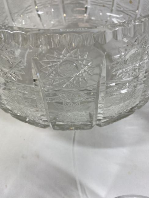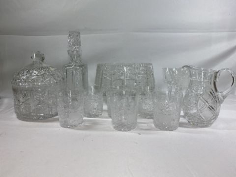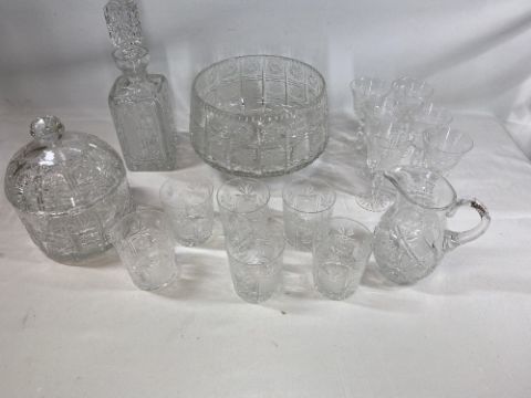GLASSWARE - cut glass assortment, all with similar sunburst type pattern to include large pedestal bowl, decanter, tumblers, ETC