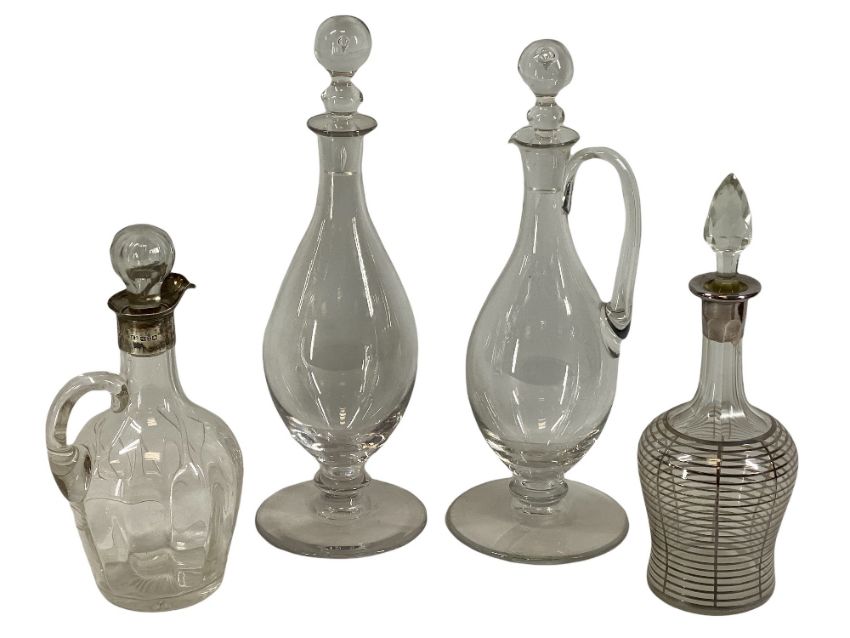 GLASS DECANTERS & CLARET JUGS (4) including two with silver collars