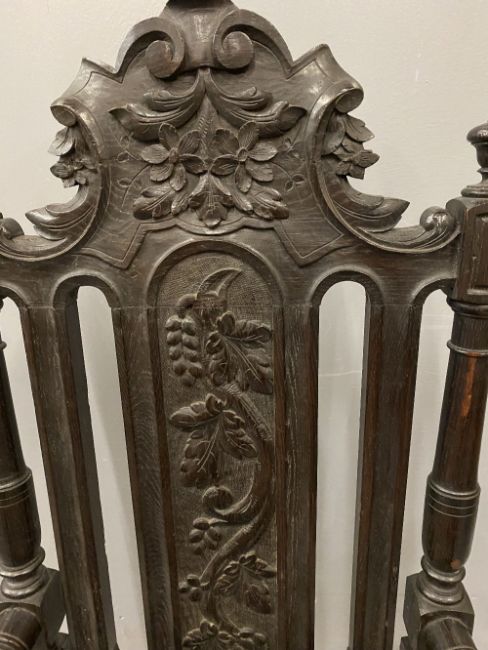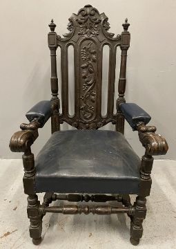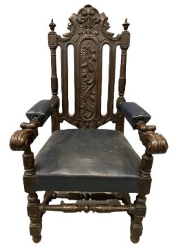 CIRCA 1900 CARVED OAK CEREMONIAL TYPE ARMCHAIR, 127cms H, 66cms W, 53cms D the seat