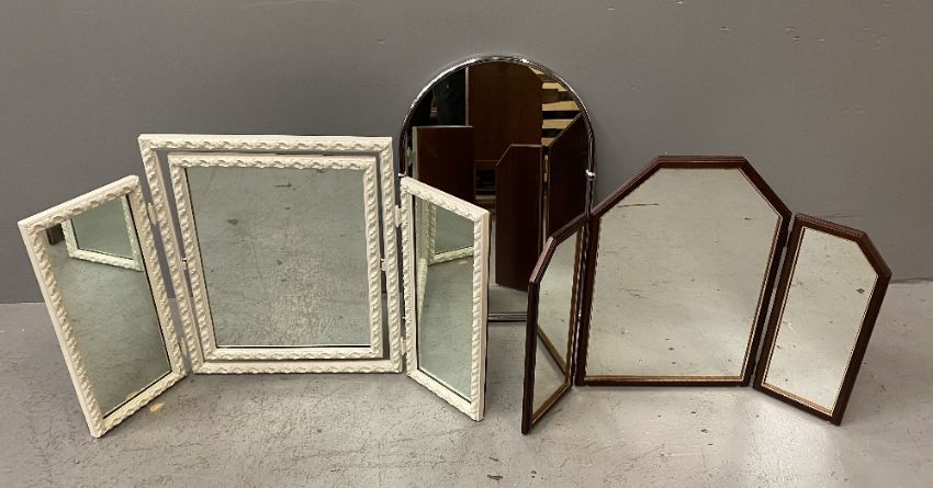 MIRRORS - two triple dressing table mirrors and a chrome framed arched top mirror