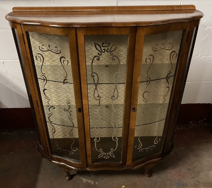 ART DECO STYLE BOW FRONTED WALNUT CHINA CABINET, 107cms H, 105cms W, 39cms D
