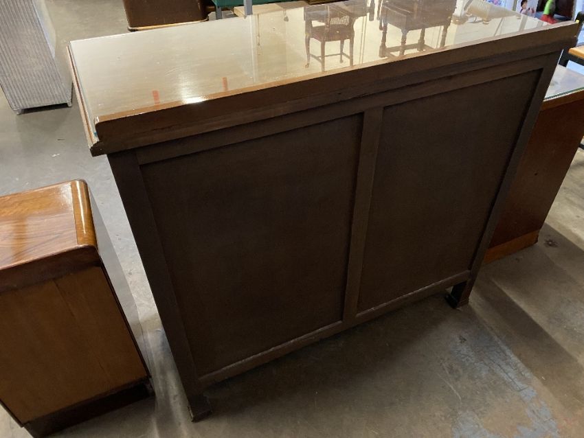 VINTAGE WALNUT CHEST OF DRAWERS with Art Nouveau handles to two long over three shorts drawers, 100cms H, 107cms W, 50cms D and two walnut effect pot cupboards